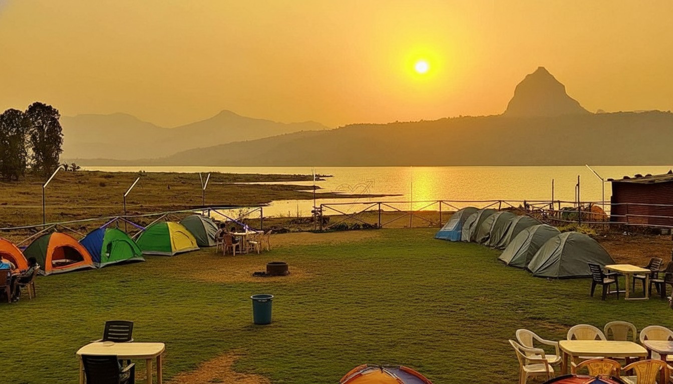 Pawna Lake is a serene artificial lake surrounded by hills and forts near Lonavala, famous for picnics, camping, sunsets, and peaceful nature views.